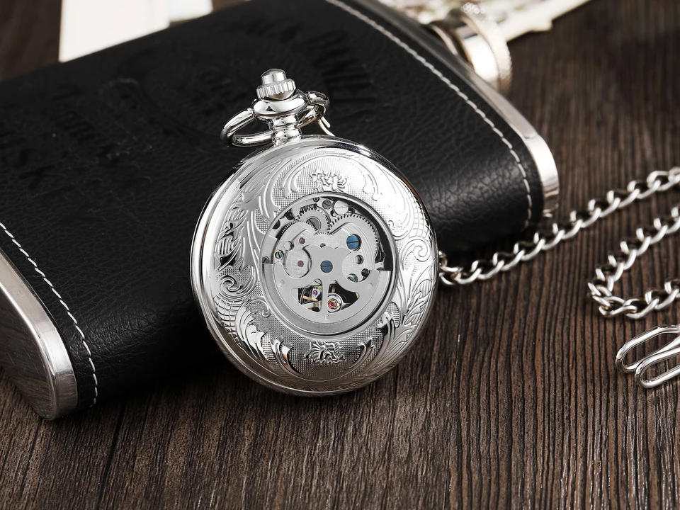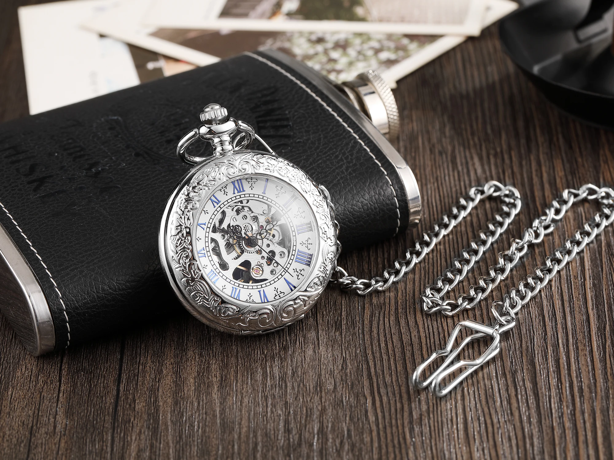 Silver Roman Numerals Machinery Pocket Watch Chain Hollow Vintage