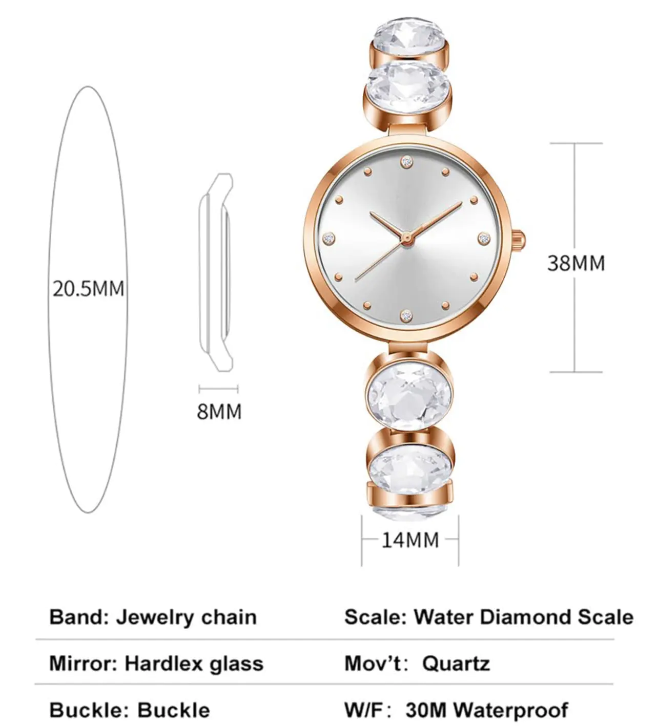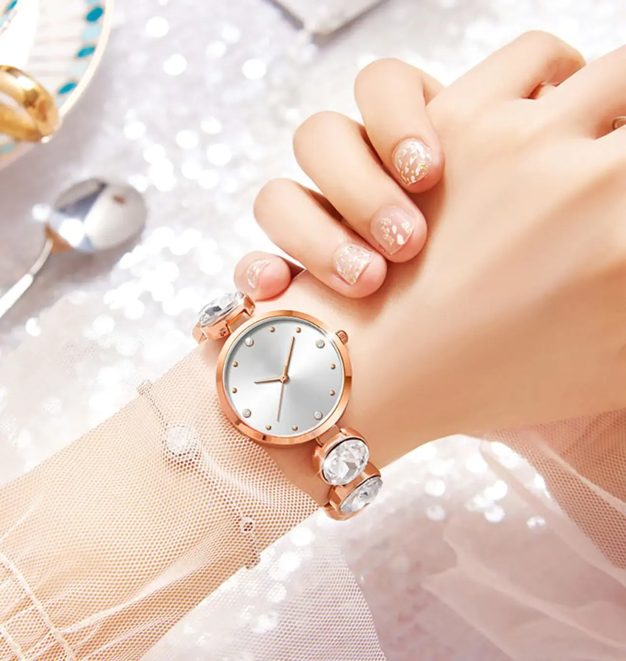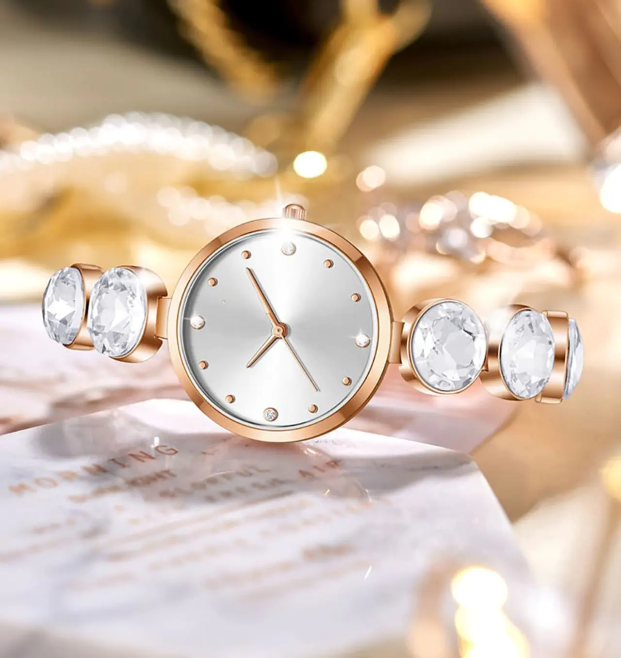 Diamond watches for women: This watchwith a luxurious appearance, cooperate the design of diamonds, the entire watch presents a luxurious and noble atmosphere. Gold and diamonds are a classic combination that has never changed. Wearing this watch, you will be confident and charming.